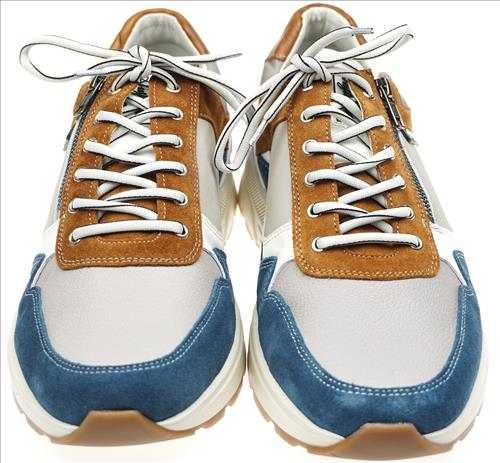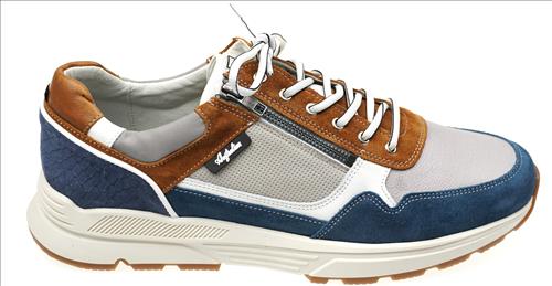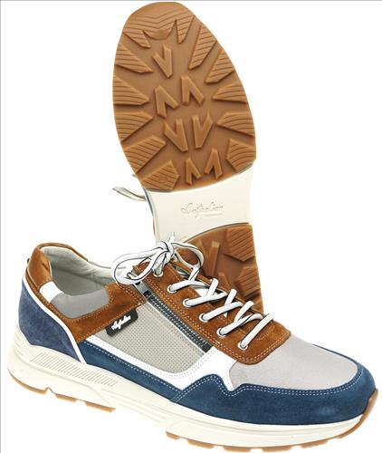 Australian Connery sneaker in grijs/denimblauw/cognac combinatie. Deze schoenen zijn op voorraad vanaf maat 42. Maat 42 t/m 46 € 179,95.