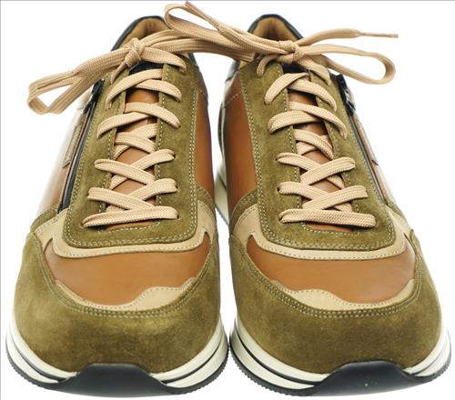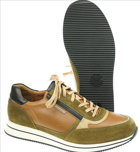 Mephisto Gilford veterschoen in kakhi/cognac combinatie. Deze schoenen zijn op voorraad vanaf maat 40. Maat 40 t/m 46 € 215,=.